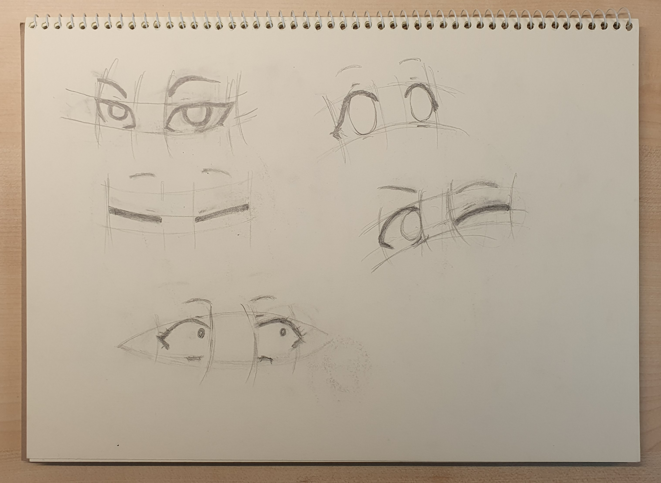 그리고 여러 가지 눈모양을 그리는 방법이 있습니다. 다양한 감정 표현을 위해 눈썹과 눈동자 등을 그려 눈 그림을 마무리해 줍니다. 눈썹과 눈동자에 따라 표현할 수 있는 감정은 천차만별입니다. 측면으로 눈 위치를 잡아주었다 해도 눈동자 방향에 따라 왼쪽을 응시한다거나 오른쪽을 응시하게끔 표현할 수 있습니다. 만약 감고 있는 눈 또는 윙크하는 눈을 그리고 싶다면 똑같이 가로 선과 세로 선을 그려 놓은 다음 보이는 네모상자의 중심에서 약간 아래로 선을 두껍게 그려주면 됩니다.