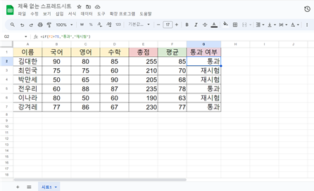 구글 스프레드시트 조건 함수 사용하여 성적표 만들기 1